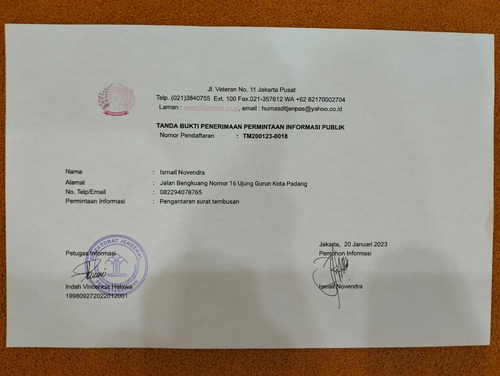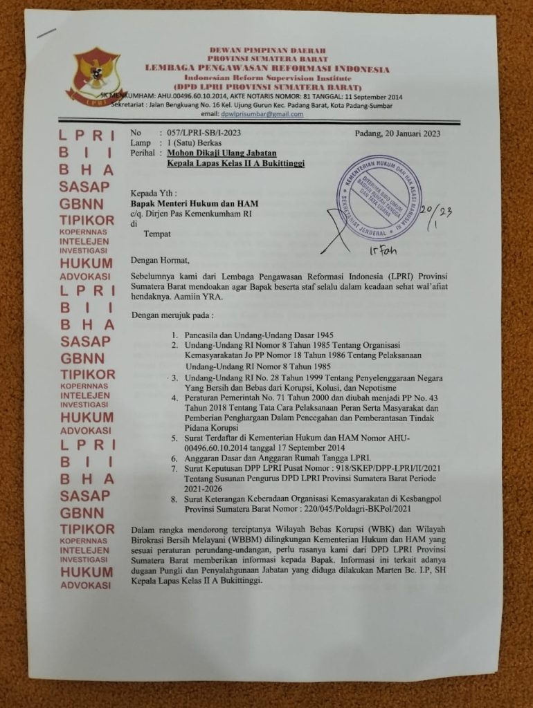 Surat No : 057/LPRI-SB/I-2023 itu diantarkan langsung oleh IN Raja Tega sekretaris LPRI Sumbar ke Kantor Kementerian Hukum dan HAM di Kuningan Jakarta. Selain itu, tembusan surat juga diantarkan ke kantor Dirjen Pemasyarakatan yang terletak di Jalan Veteran Jakarta.
