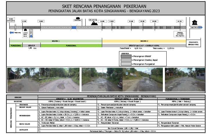 Proyek Peningkatan Jalan Batas Kota Singkawang – Bengkayang ini dilaksanakan melalui Satuan Kerja Dinas PUPR Provinsi Kalbar, Bidang Bina Marga. Pengawasan teknis proyek tersebut dilaksanakan oleh CV.Absri Ananta Konsultan yang di biayai APBD Prov. Kalbar T.A 2023, senilai Rp. 788.988.000,00.