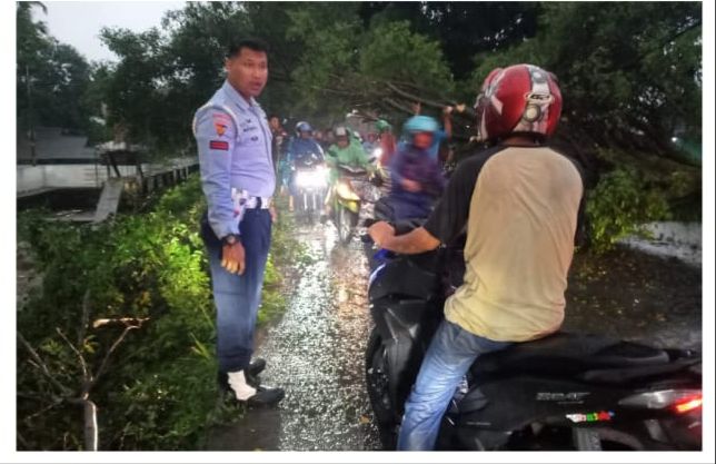 Pohon beringin setinggi 8 meter tersebut tumbang usai di terjang hujan di sertai angin kencang. Akibat kejadian tersebut arus lalu lintas kendaraan terganggu, akibat badan jalan tertutup oleh material pohon.