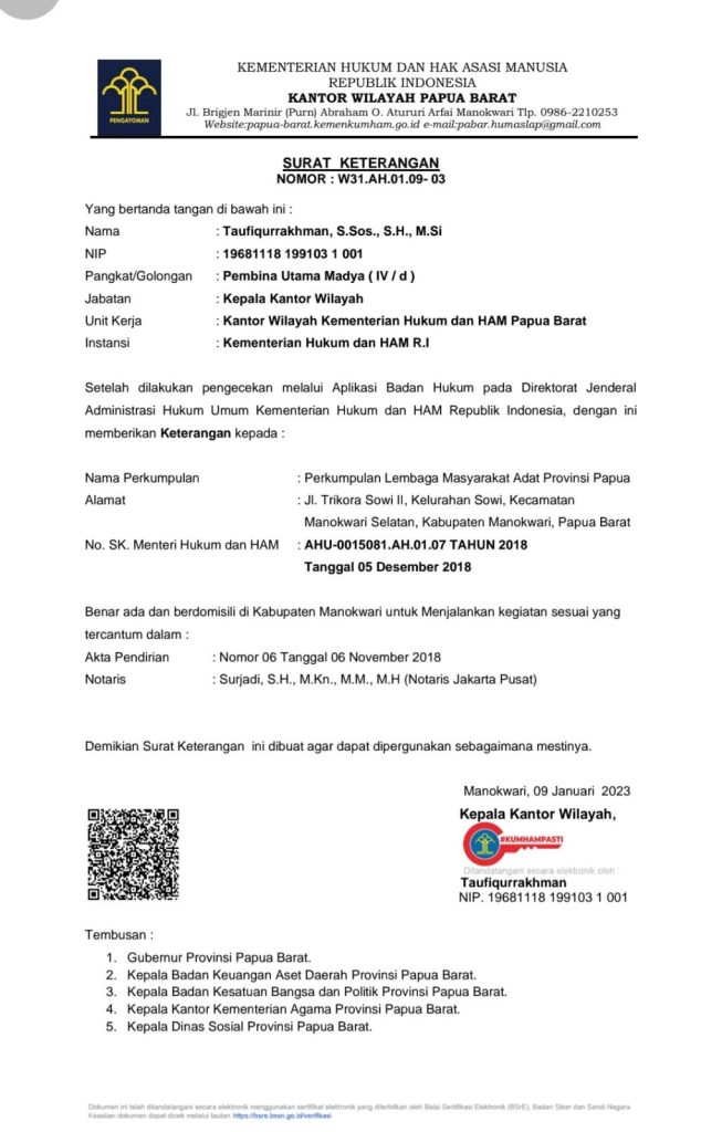 Kordinator wilayah Lembaga masyarakat Adat (Korwil LMA) yang sudah terdaftar di menkumham dan sipatnya hanya memberikan surat pemberitahuan kehadiran ormas tersebut di provinsi atau kabupaten kota,