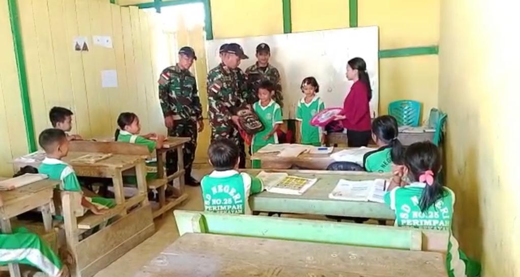 Perosnel Satgas Pamtas RI-MLY Yonarmed 19/105 Trk Bogani Bagikan Perlengkapan Sekolah Kepada Siswa Di Hari Pendidikan Nasional