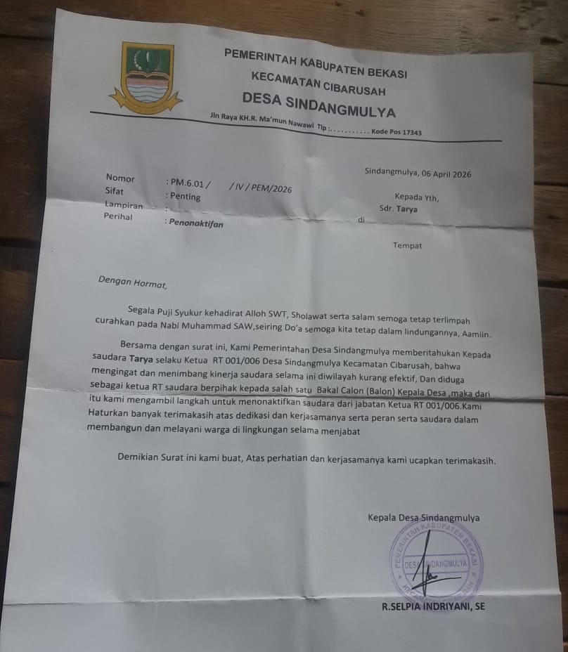 BEKASI, MEDIAPOLRINEWS – Sebuah surat penonaktifan sepihak yang dikeluarkan oleh Kepala Desa Sindang Mulya, Kecamatan Cibarusah, Kabupaten Bekasi, Jawa Barat, tengah menjadi sorotan publik dan viral di berbagai kalangan warga Cibarusah. Surat bernomor PM.6.01/IV/PEM/2026 tertanggal 6 April 2026 itu ditujukan kepada seorang ketua Rukun Tetangga (RT) dan Ketua Rukun Warga (RW) atas dugaan keberpihakan politik jelang Pemilihan Kepala Desa (Pilkades) 2026.