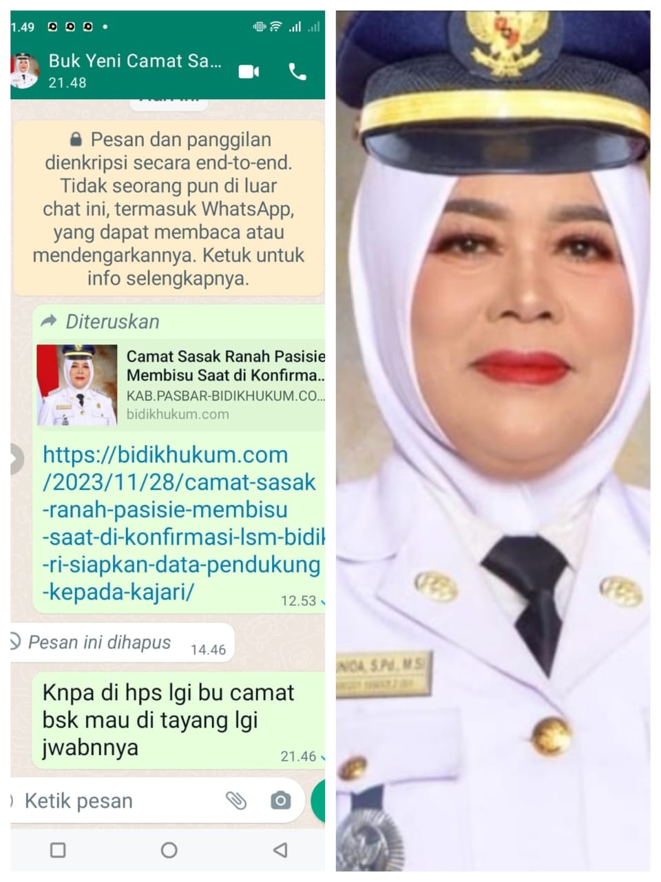 Hitungan beberapa jam kemudian, Camat Ranah Pasisie Kab. Pasbar menghapus chat jawabannya pada pukul 14.46 wib kemarin (Selasa tanggal 28 Nopember 2023) saat di tanya kenapa di hapus lagi Bu camat tidak menggubris sampai berita ini di terbitkan.
