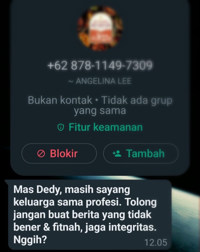 “Mas Dedy, masih sayang keluarga sama profesi. Tolong jangan buat berita yang tidak bener & fitnah, jaga integritas. Nggih?.” Itulah tulisan pesan yang dikirim orang yang tidak dikenal memakai nomor +62 878-1149-7309 tertulis nama Angelia Lee pada Kamis (21/3/2024) pukul 12.05 Wib.