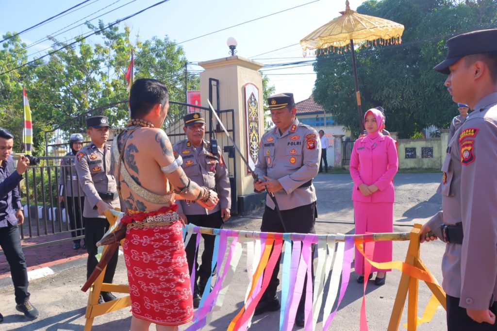 SINTANG, KALIMANTAN BARAT , MEDIAPOLRINEWS | Penyambutan Kapolres Sintang digelar dengan tradisi pedang pora sekaligus upacara adat Dayak dan Melayu di halaman Mapolres Sintang, Selasa (18/7) pagi.