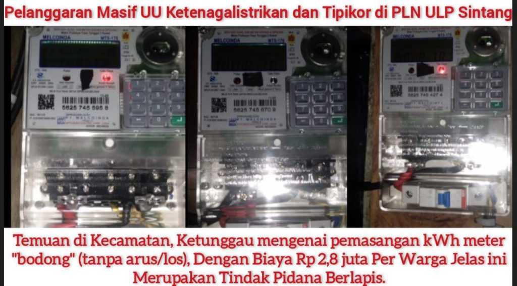 Temuan di Kecamatan, Ketunggau mengenai pemasangan kWh meter “bodong” (tanpa arus/los) dengan biaya Rp 2,8 juta per warga merupakan tindak pidana berlapis.
